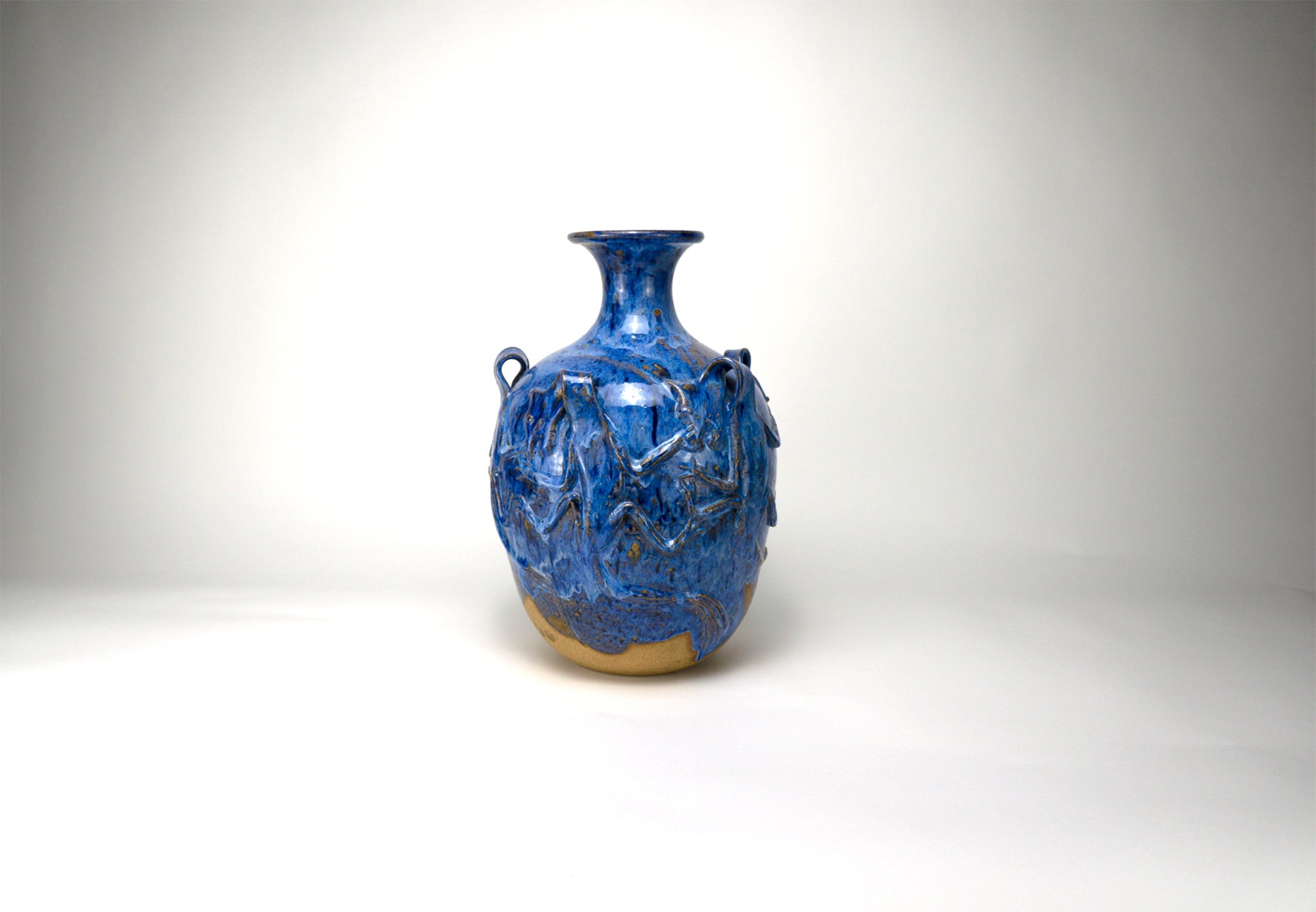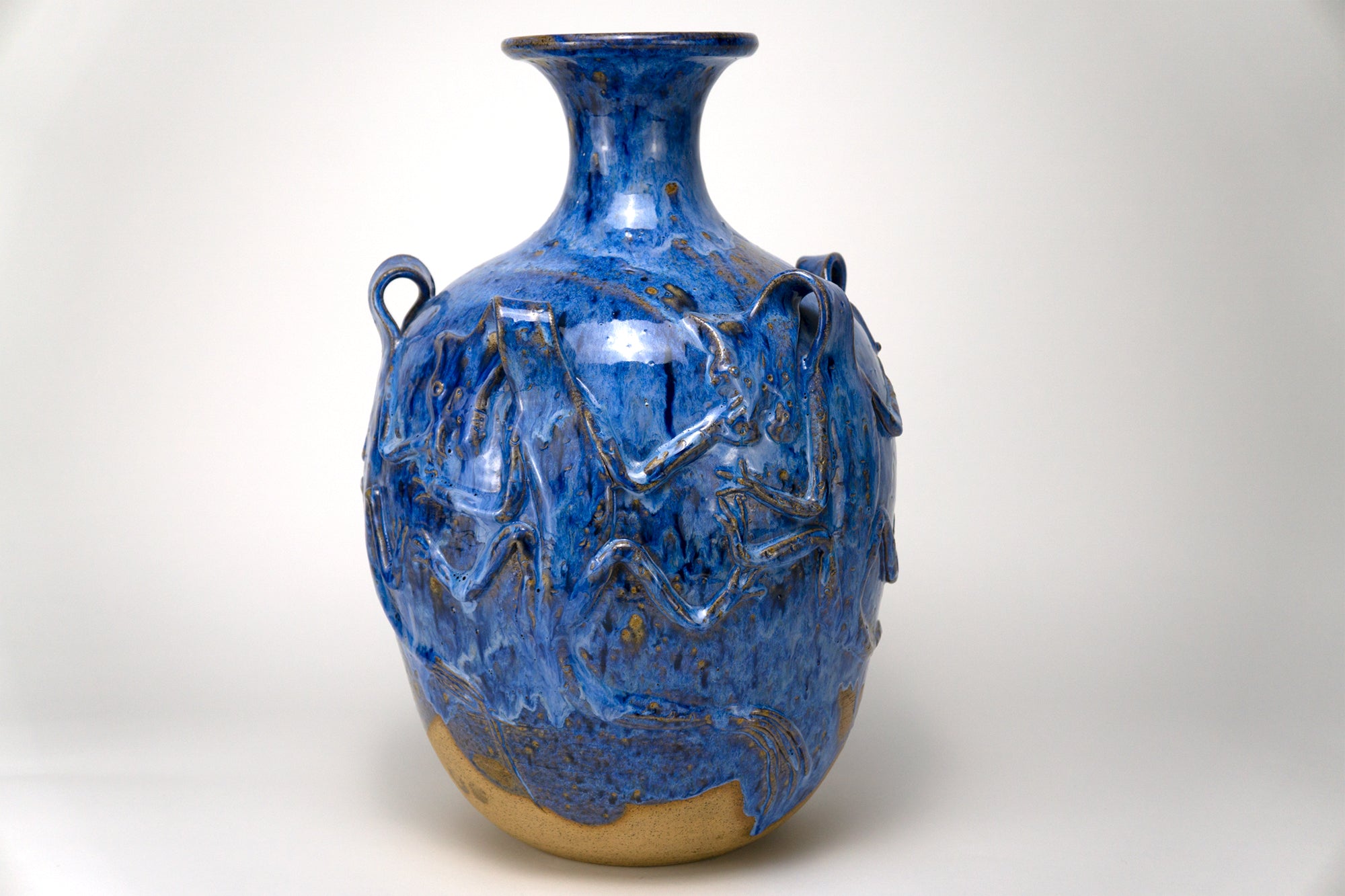 This vase is a spectacular and dramatic showpiece, featuring writhing dragon figures around the entire mid-section. Their “tails” act as handles for the vase. In Chinese art, the dragon motif is a powerful one signifying imperial rule. No doubt this artist intended a modern interpretation of this theme.