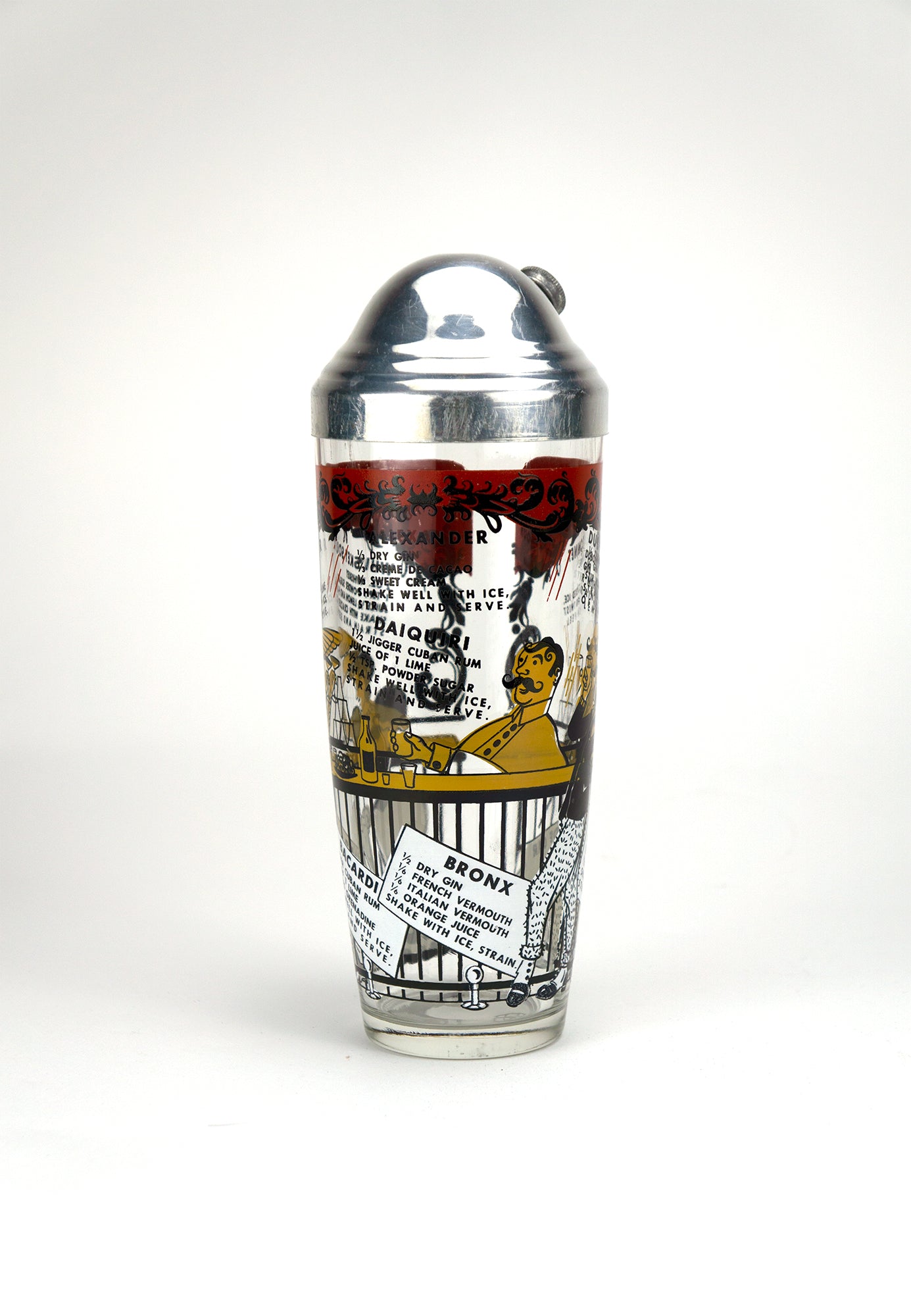 A glass Wild West “Ragtime” themed shaker features recipes for classic cocktails. Topped with an aluminum lid and strainer. Ready to be put to use or as decorative display for the home bar.