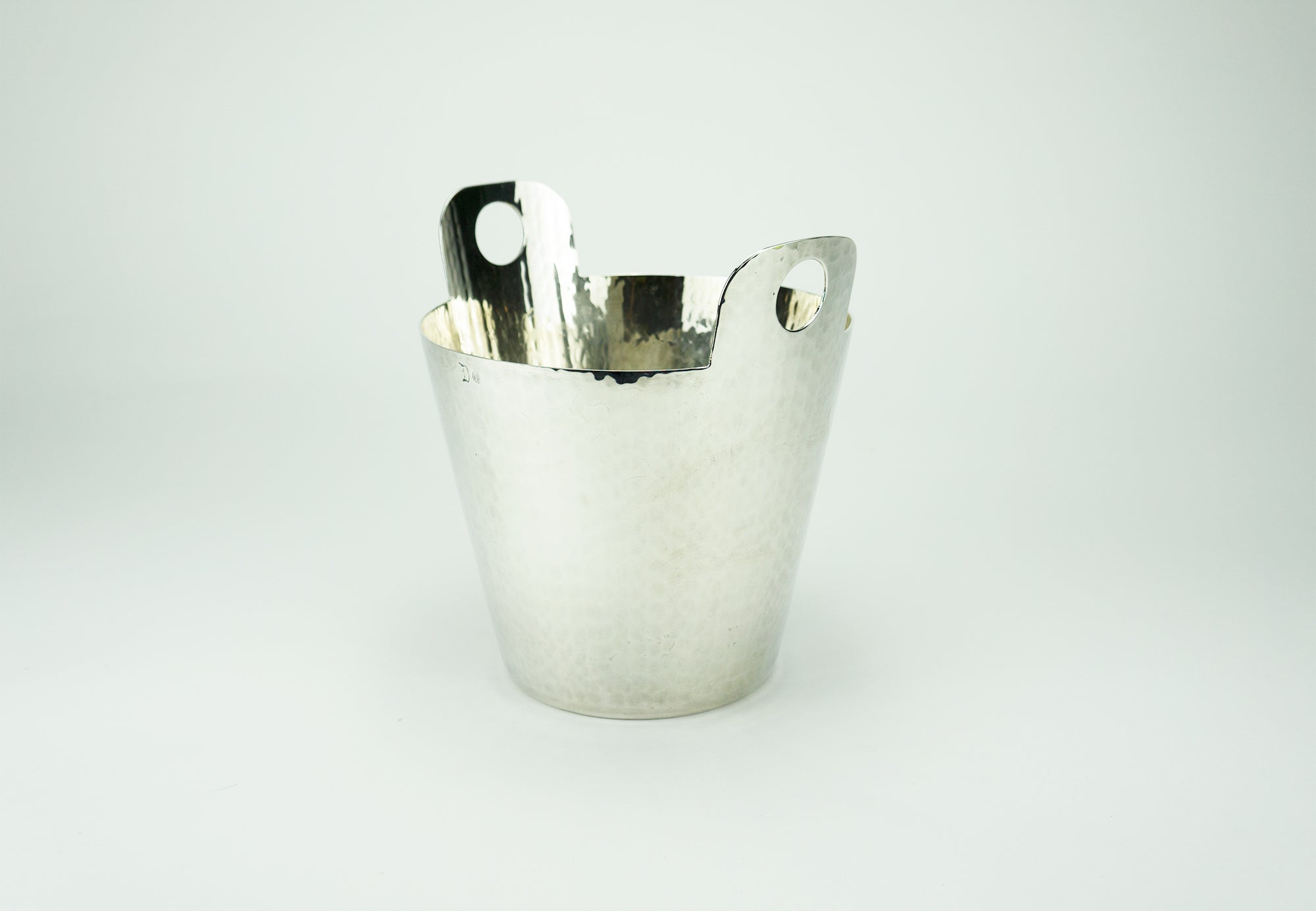 Calegaro was founded in 1921 and is one of Italy’s most famous silversmiths. This midcentury champagne bucket is hand-finished with hammered silverplate. Hallmarked at the rim. Very good condition with very minor wear.