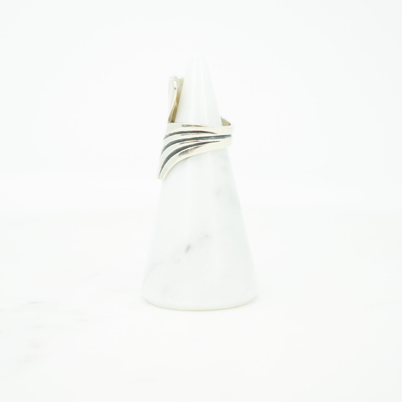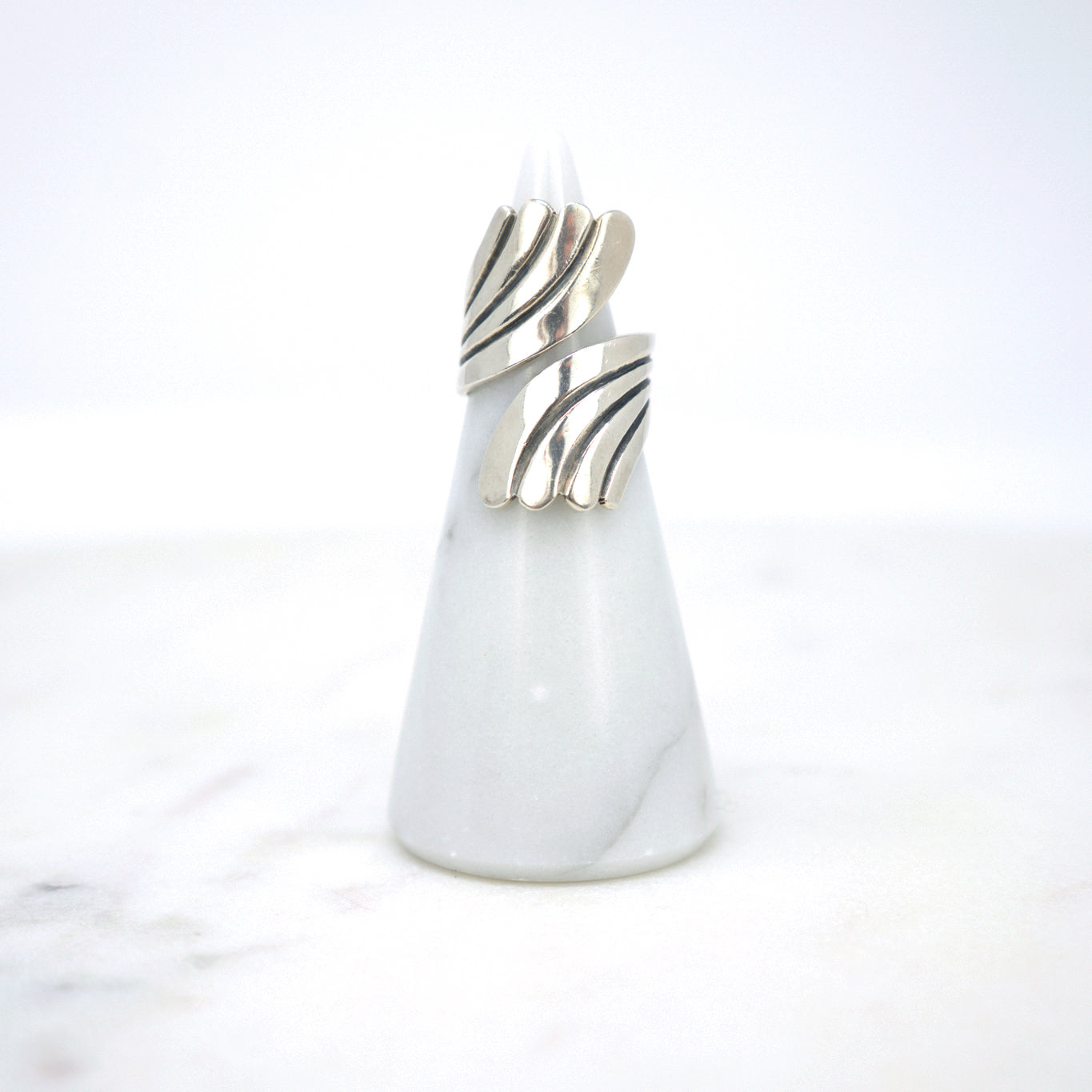 Made in Taxco, Mexico by R. Cazares featuring a single piece of silver formed into two stylized waves.