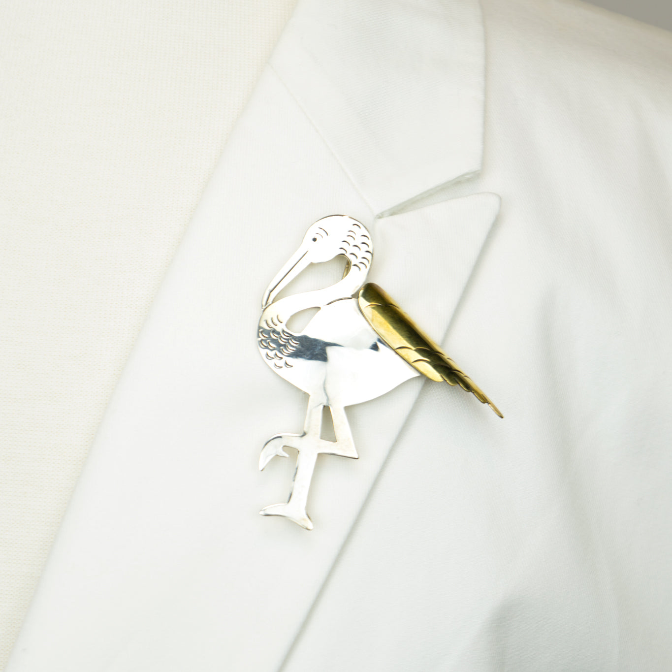 A circa 1940 flamingo rendered in sterling silver with a brass wing. Flamingos were a popular theme in 1930s and 40s, made even more so when the Duchess of Windsor wore one made by Cartier.