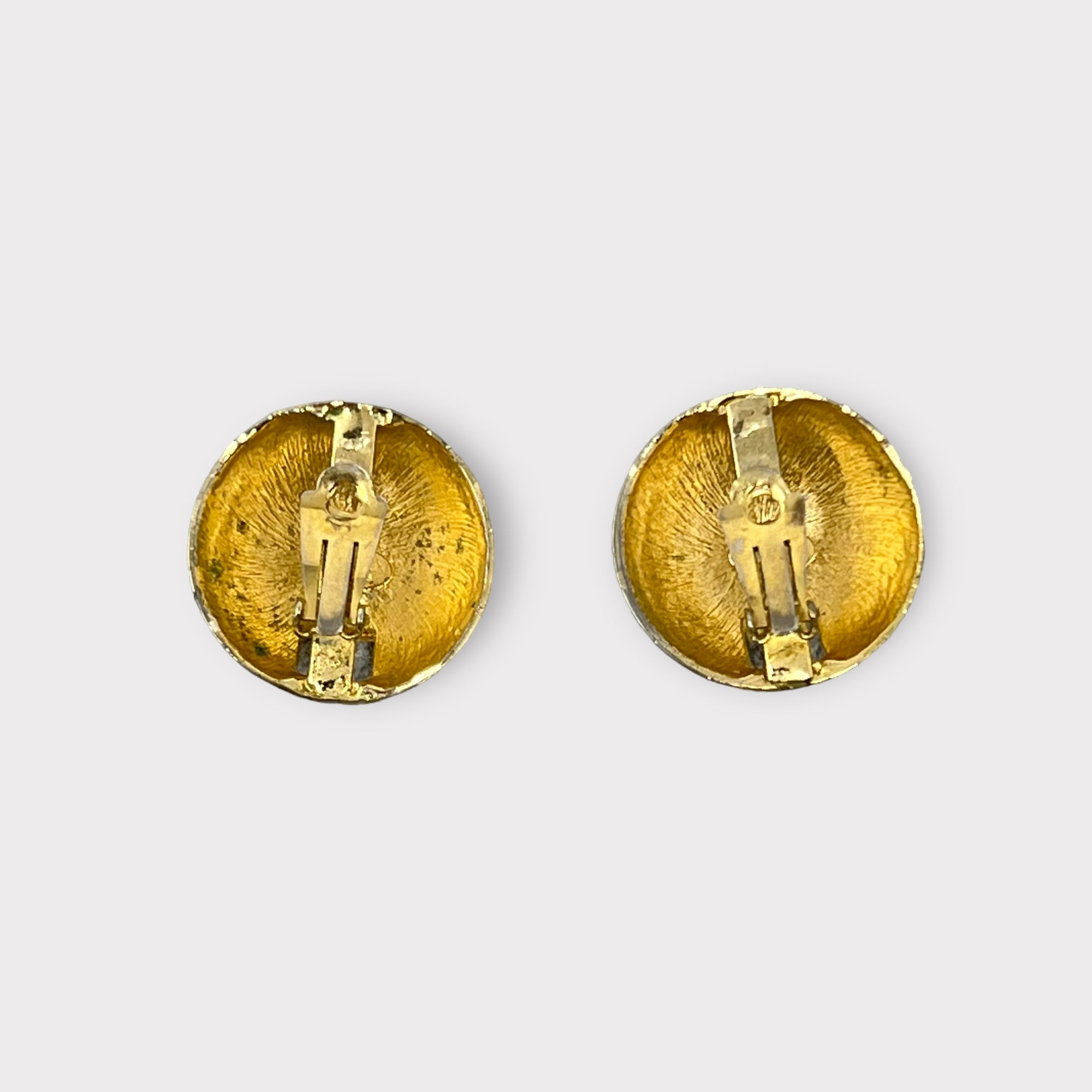 These geometric button-style earrings by Lanvin Paris feature color blocks in reflective emerald green and jet black, and topped with a cut-out window. While they harken from the 1960s, button earrings had a resurgence in the 80s. We think they’re ripe for rediscovery. Clip fastener.